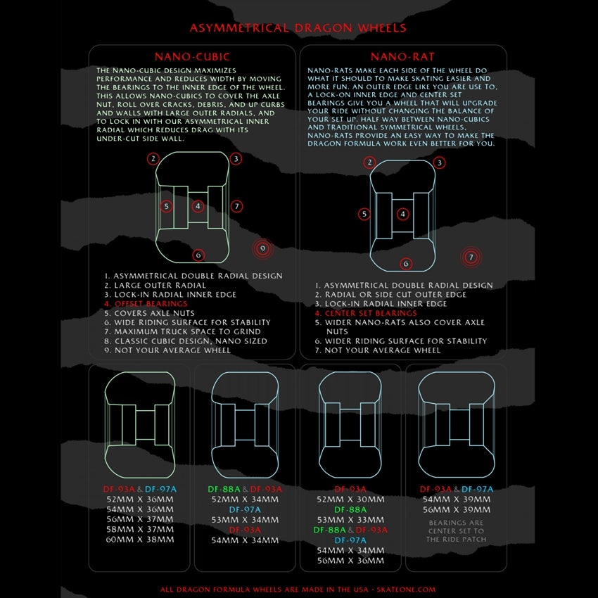 Nano-Rats zetten beide kanten van het wiel aan het werk, waardoor skaten makkelijker en leuker wordt. Het heeft de buitenrand die je gewend bent, een lock-on binnenrand en center set lagers om je een wiel te geven dat je rit zal upgraden zonder de balans van je set-up te veranderen. Halverwege tussen Nano-Cubics en traditionele symmetrische wielen, bieden Nano-Rats een eenvoudige manier om de Dragon Formula nog beter voor je te laten werken.