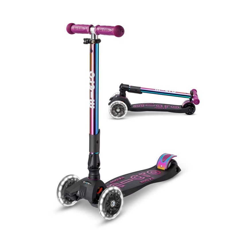 De bekroonde Maxi Micro Deluxe inklapbare step met LED wielen (5-12 jaar) biedt hetzelfde intuïtieve en geliefde 'lean-to-steer' systeem als de Mini Micro, waarvan Micro Mobility de uitvinder is. Het grotere en robuuste frame van deze kinderstep is speciaal ontworpen voor oudere en sterkere kinderen. Alle Micro-producten zijn vriendelijk voor de planeet, handig qua ruimte, en perfect voor korte ritten.