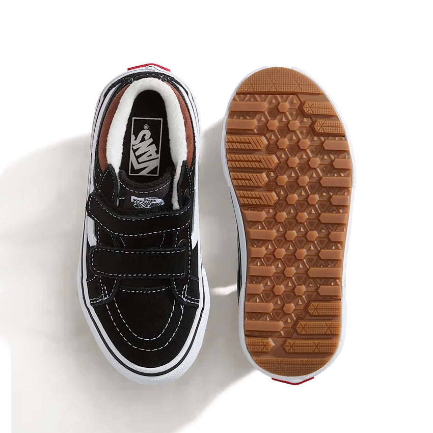 De Sk8-Mid schoenen voor kinderen zijn geïnspireerd op de legendarische halfhoge Vans en brengen het beste van beide werelden samen met een vertrouwde Sk8-Hi-look, een klassiek halfhoog model en klittenbandsluitingen voor een stevige pasvorm, zonder gedoe. Trek in een handomdraai je schoenen aan en beleef een geweldige dag.