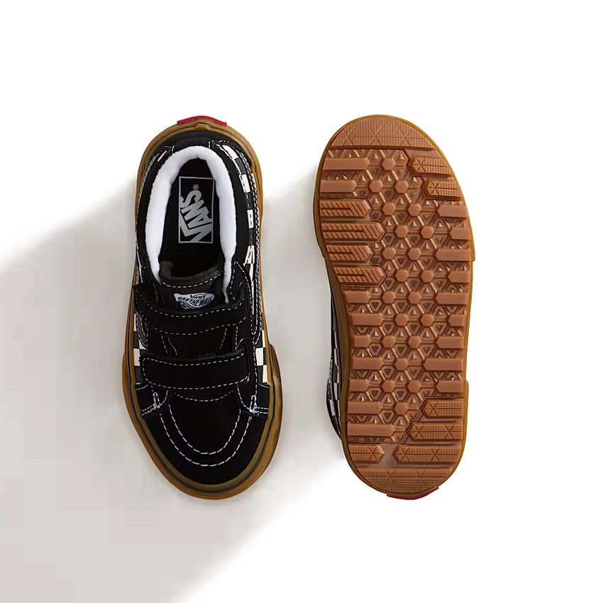 De Sk8-Mid voor kinderen is geïnspireerd op de legendarische halfhoge Vans en brengt het beste van beide werelden samen met een vertrouwde Sk8-Hi-look, een klassiek halfhoog model en klittenbandsluitingen voor een stevige pasvorm zonder gedoe. Trek in een handomdraai je schoenen aan en beleef een geweldige dag.